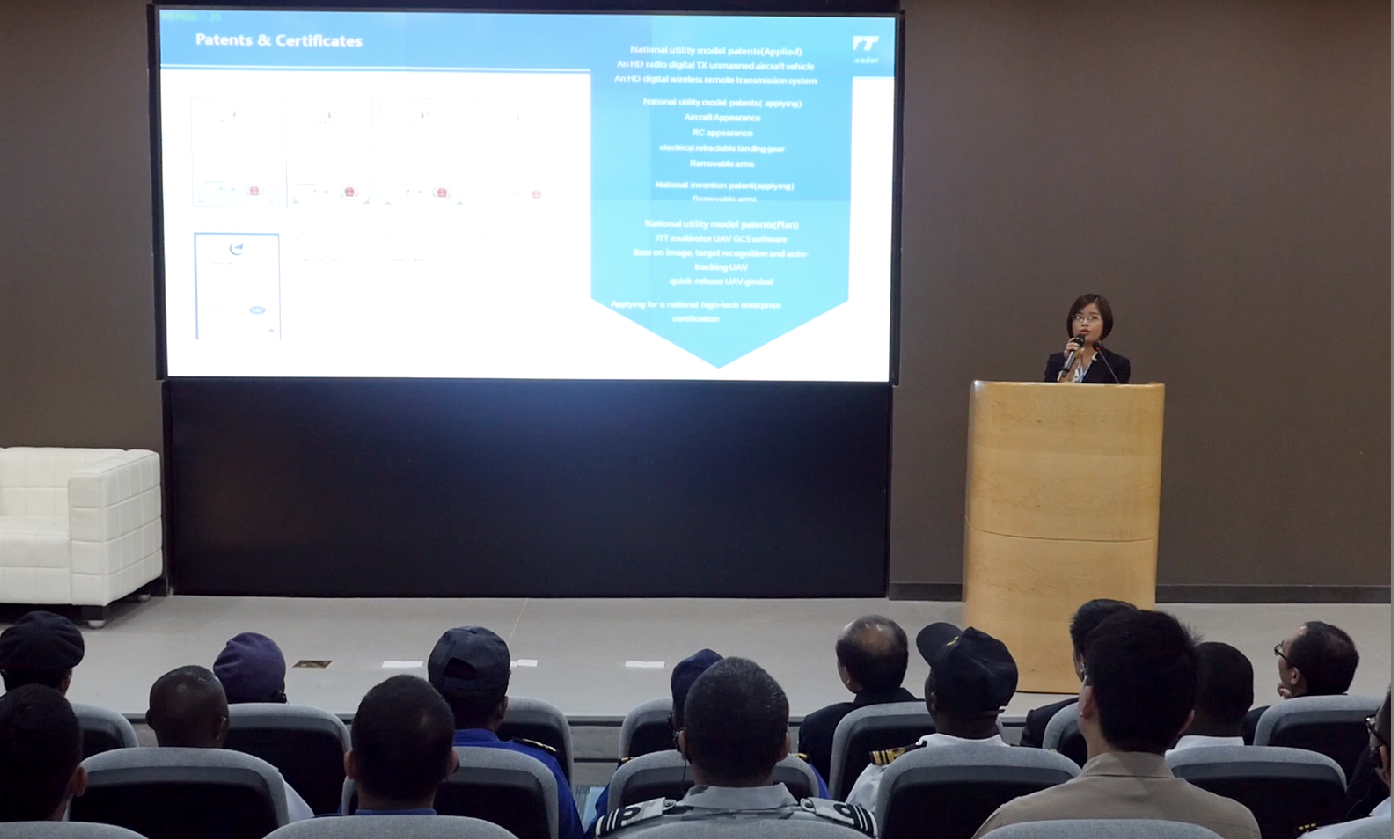 智璟科技COCO女士在演講臺上給使團(tuán)們介紹JTT工業(yè)無人機(jī)