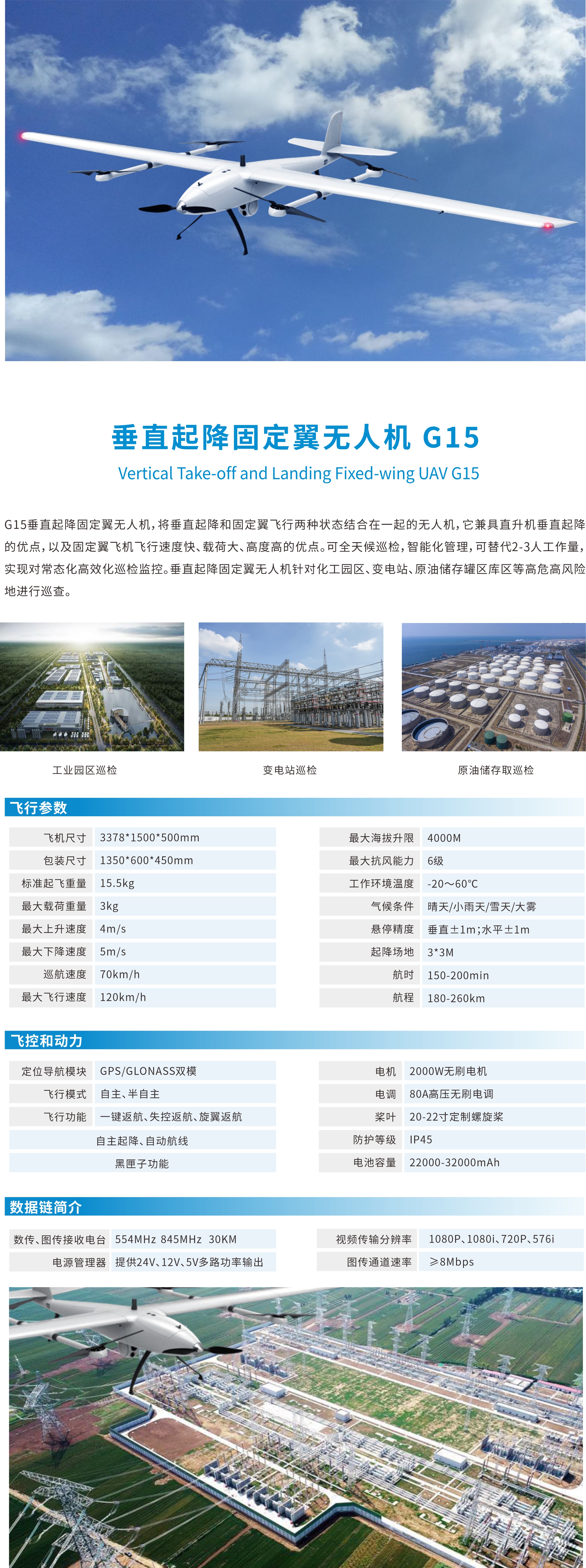 G15垂直起降固定翼無人機,將垂直起降和固定翼飛行兩種狀態(tài)結(jié)合在一起的無人機,它兼具直升機垂直起降的優(yōu)點,以及固定翼飛機飛行速度快、載荷大、高度高的優(yōu)點。可全天候巡檢,智能化管理,可替代2-3人工作量,實現(xiàn)對常態(tài)化高效化巡檢監(jiān)控。垂直起隆固定翼無人機針對化工園區(qū)、變電站、原油儲存罐區(qū)庫區(qū)等高危高風險地進行巡查。
